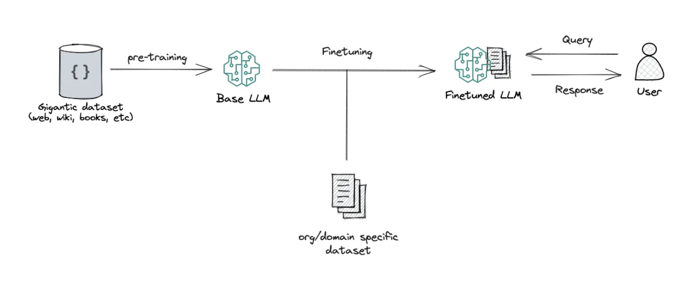 사전 훈련된 LLM을 특정 태스크나 도메인에 적응시키거나 성능을 향상시키기 위해 더 작고 구체적인 데이터셋으로 추가 훈련하는 과정입니다. 파인튜닝을 통해 데이터를 기반으로 모델의 가중치를 조정하여 애플리케이션의 고유한 요구사항에 더 맞게 모델을 조정합니다.