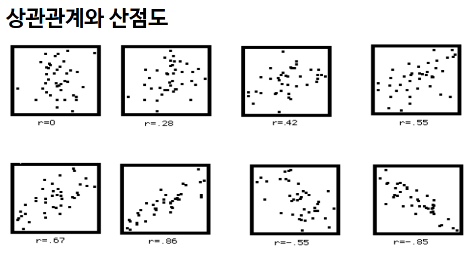- [부호] 상관관계 값이 0에 가까울수록 직선관계가 없으며, -1에 가까울수록 강한 음의관계, +1에 가까울수록 강한 양의 관계를 가집니다.