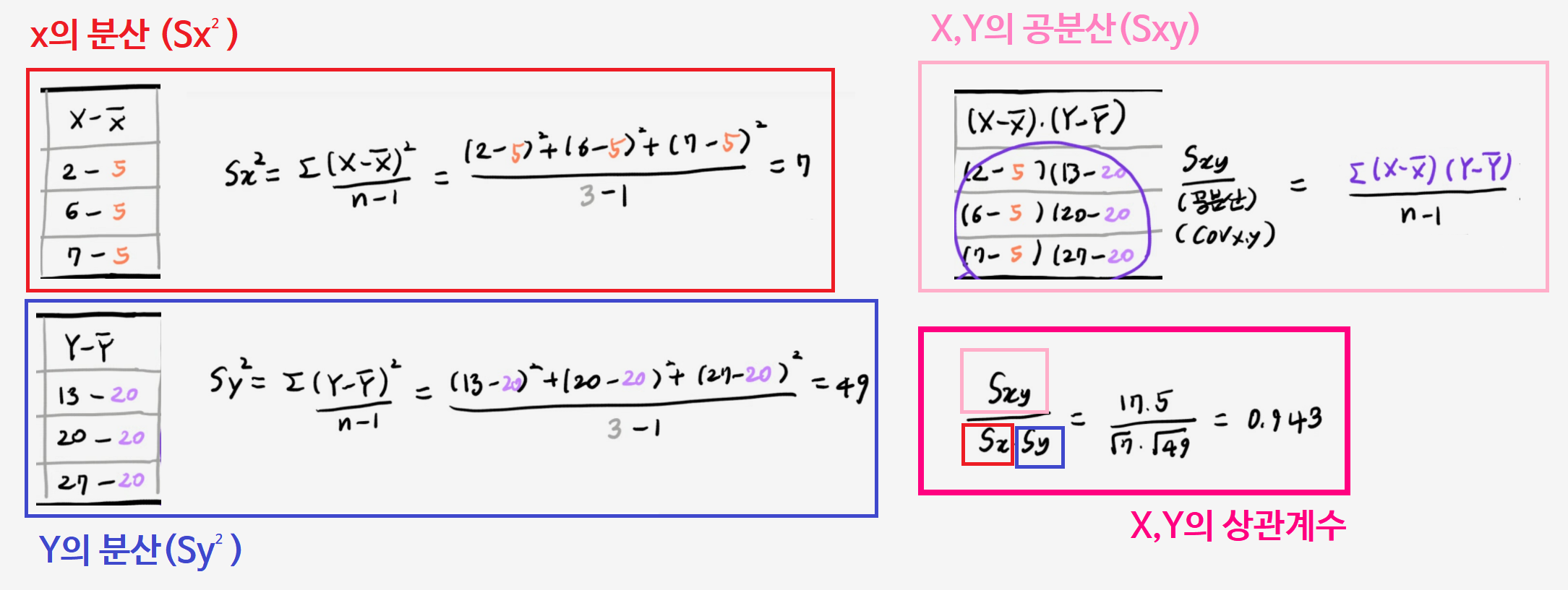: 아래는 데이터의 개수가 3인 변수 X,Y가 있습니다. 이 변수의 공분산과 상관계수를 구하는 과정을 아래 그림으로 살펴보겠습니다.