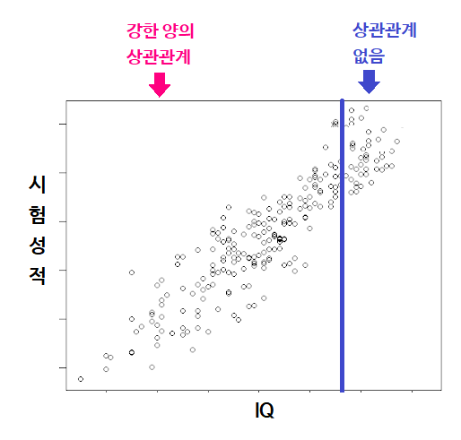 - 예를 들어서 IQ와 시험성적간의 상관계수를 구한다고 할때, 확보한 IQ의 범위가 140 이상인 관측치밖에 없다면, 두 변수간 상관관계가 매우 낮게 나올 것입니다.
