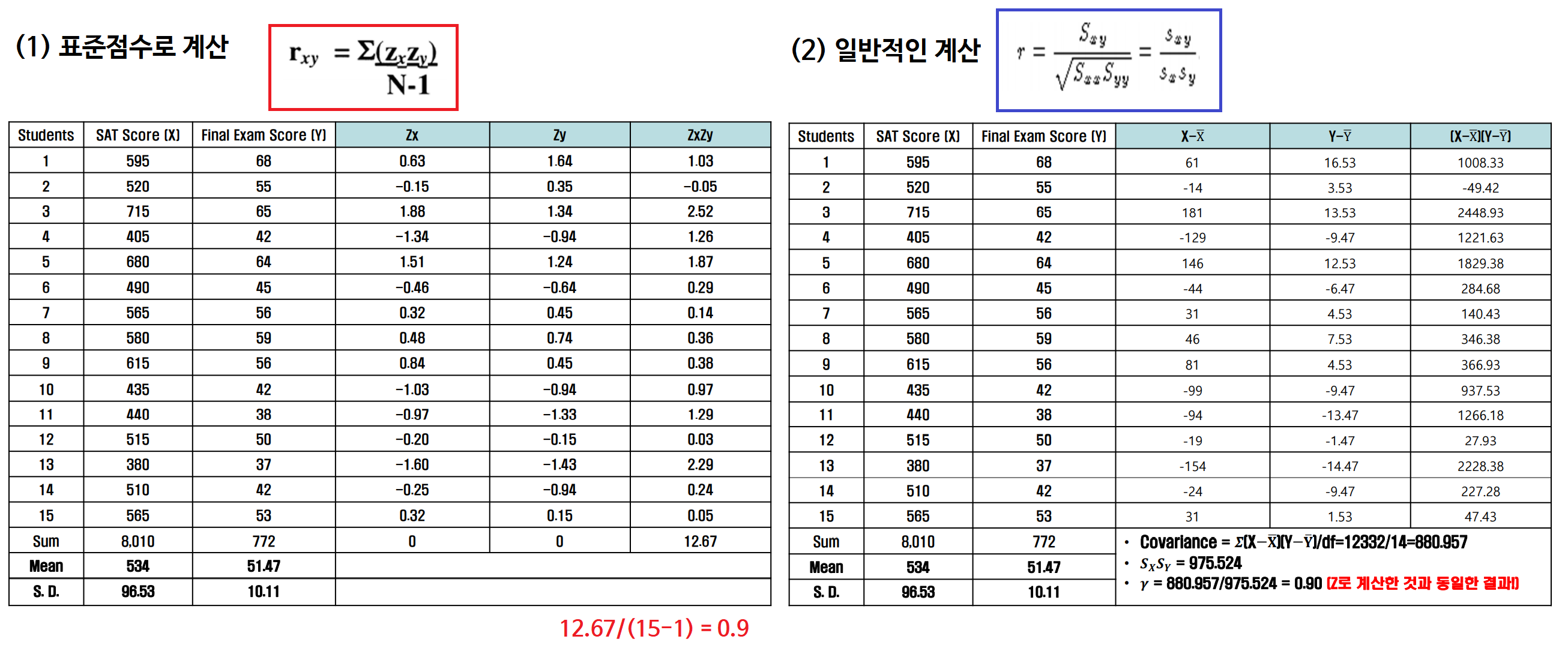 - 피어스 상관계수는 표준점수(Z)값을 통해서 구하는 방법도 있는데요, 아래 이미지와 같습니다.